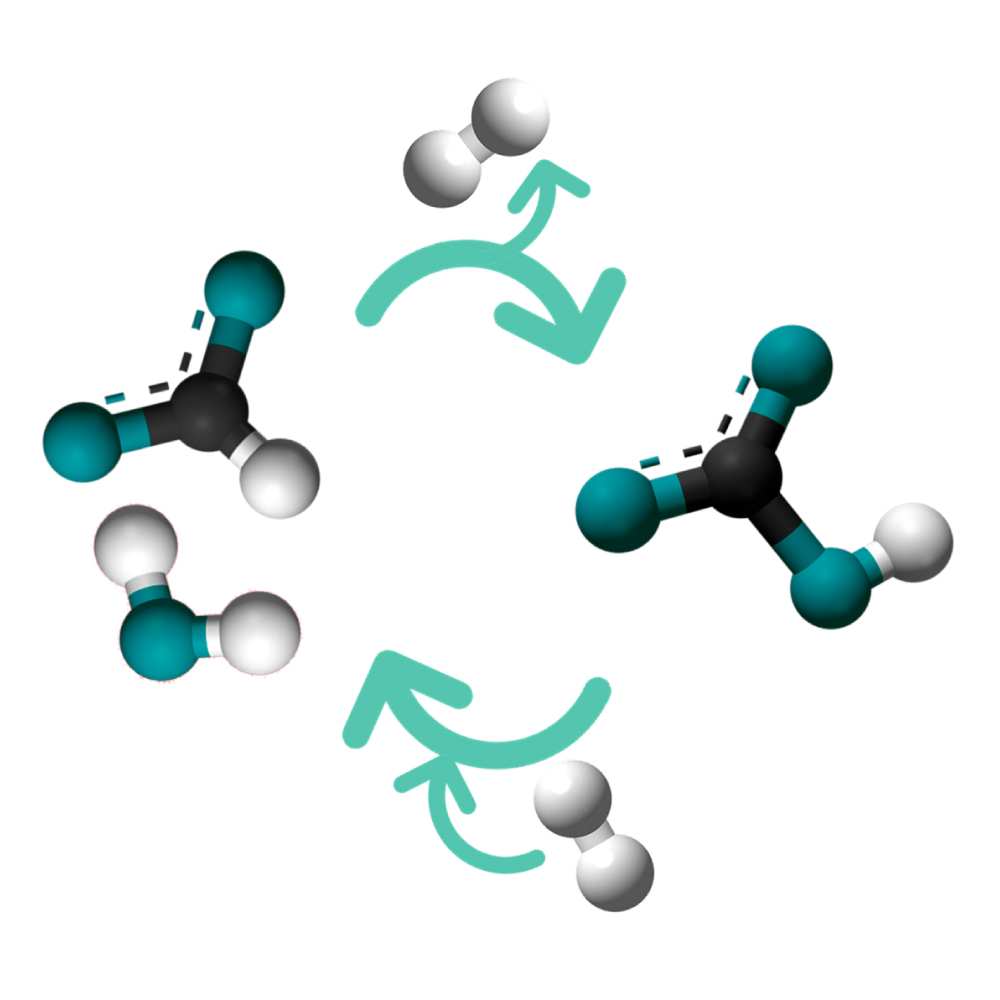 The solution containing the initial hydrogen-carbonate ions is converted into a formate by the hydrogen, in a fast, reversible and low-energy way thanks to the catalyst used.